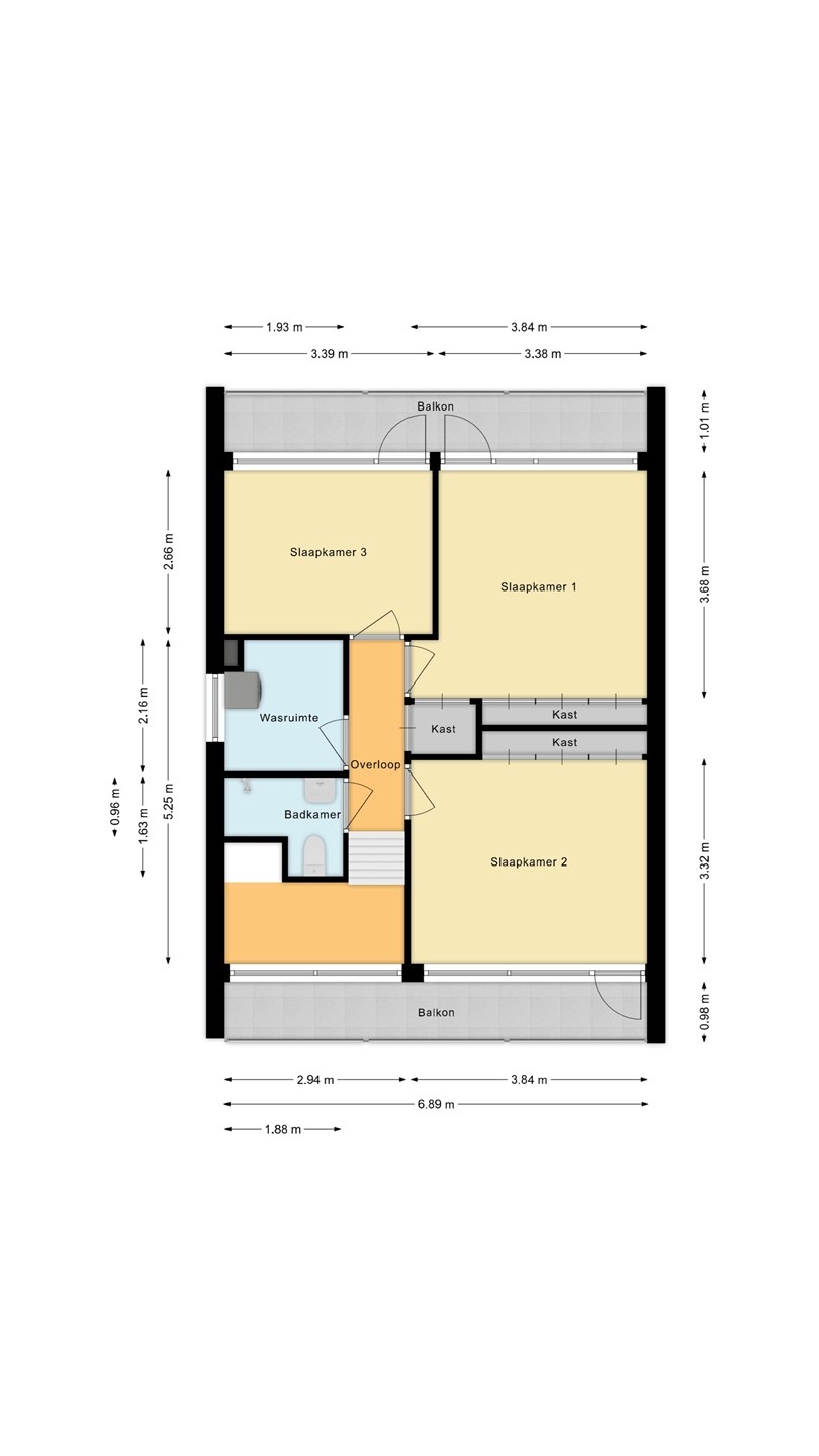 De eerste verdieping heeft een groot balkon aan zowel de voor- als achterzijde. Deze balkons zijn recent vernieuwd en bieden ruimte voor klein meubilair.